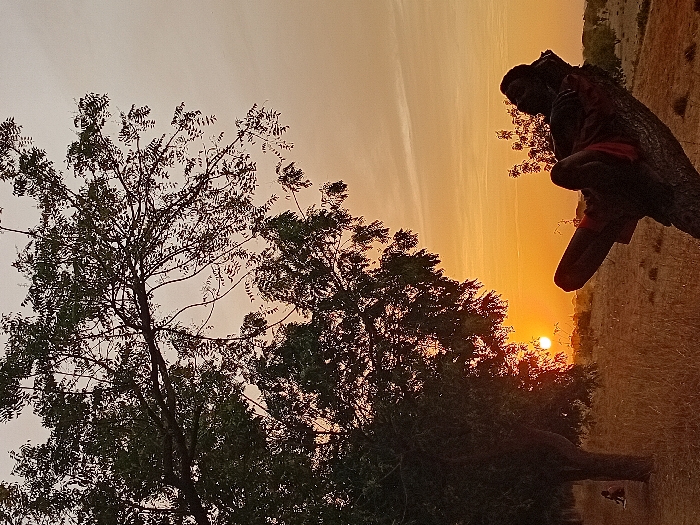 An image captured at sunset, featuring a large tree with abundant foliage dominating the left side of the frame. The setting sun casts a warm orange glow across the sky and the landscape. A person is seen perched on a leaning tree trunk on the right side, their silhouette blending with the bark. Dry grass covers the ground, adding texture and depth to the scene. The sky transitions from a light gray to a vibrant orange near the horizon.