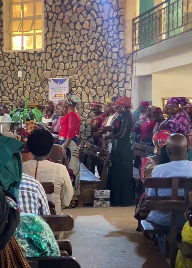 interior of a church filled with people. The church walls are constructed from stone. The congregation is seated in rows of pews. A group of women, many wearing brightly colored and patterned traditional African clothing, stand in a row in the aisle. They appear to be singing or participating in the service in some way. Towards the front of the church, there is a raised area or stage with a pulpit. A man in a blue shirt is standing at the pulpit, possibly giving a sermon or address. A banner on the wall behind the pulpit reads "Church of Christ in Nations". There is also a television screen visible, though the content on the screen is not clear. The atmosphere suggests a religious service or gathering.