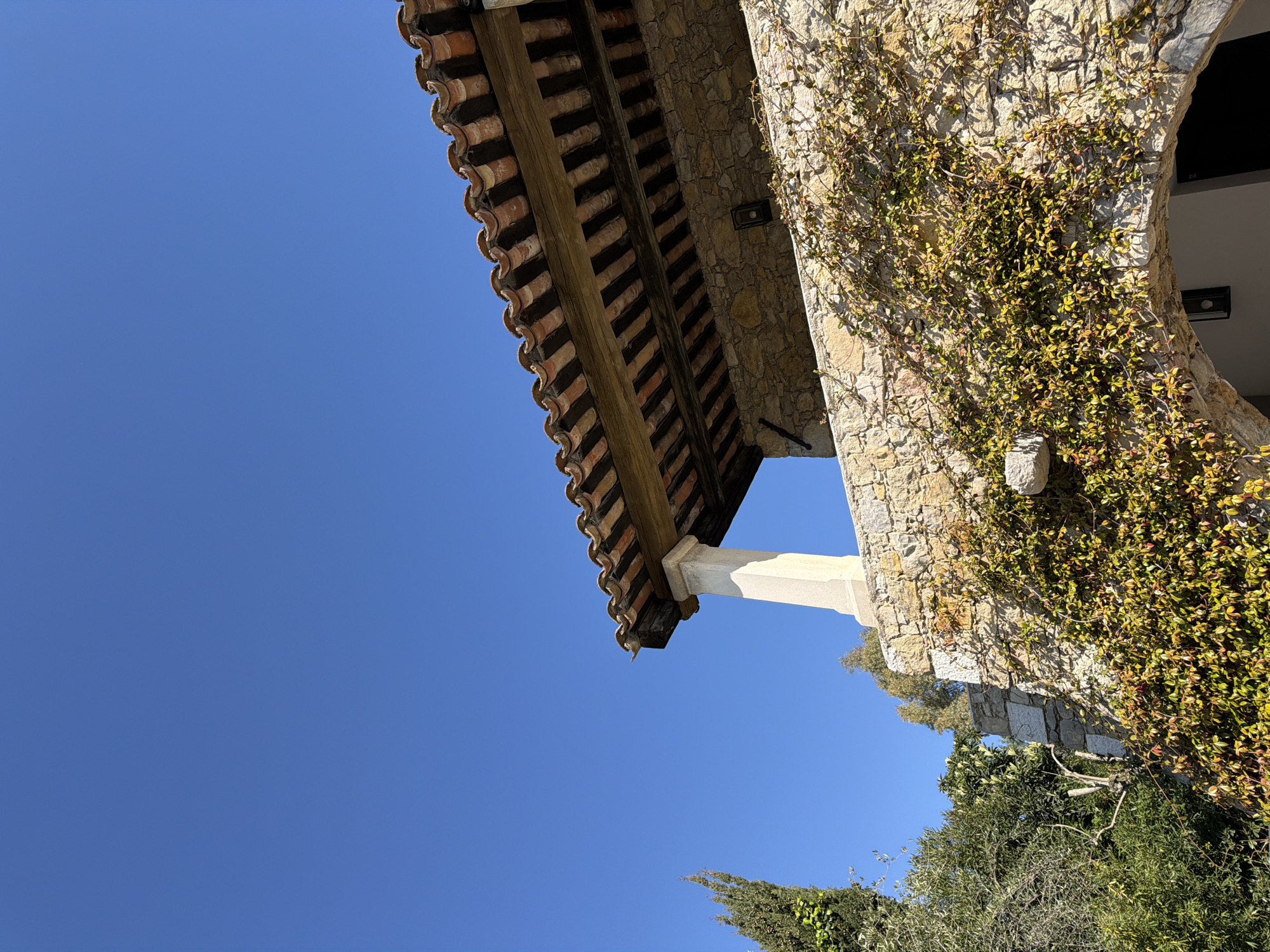 - "The image displays a low-angle view of a traditional stone building under a clear blue sky, situated in Mougins, France" by FM-xygyB2, licensed under CC BY 4.0