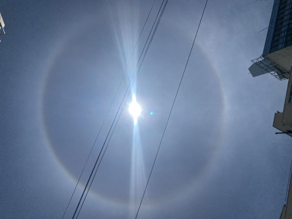 A wide-angle upward view captures a prominent 22-degree solar halo centered around a brightly shining sun in a clear, light blue sky over La Paz, Bolivia
