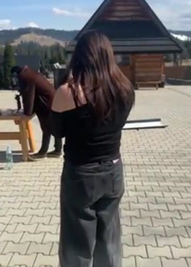 behind-the-scenes look at a video shoot. A woman with long brown hair is standing in the foreground, facing away from the camera. She's wearing a black off-the-shoulder top and gray pants. In the background, a man wearing a long brown coat and a hat is leaning over a wooden table, adjusting a camera. The table has various items on it, including what appear to be lenses, a bottle of water, and other film equipment. The woman then sits on the table to be filmed. A black puffer jacket lies on the table in front of her. The setting is an outdoor paved area with a log cabin in the background and a view of forested hills. The sky is blue with some clouds.