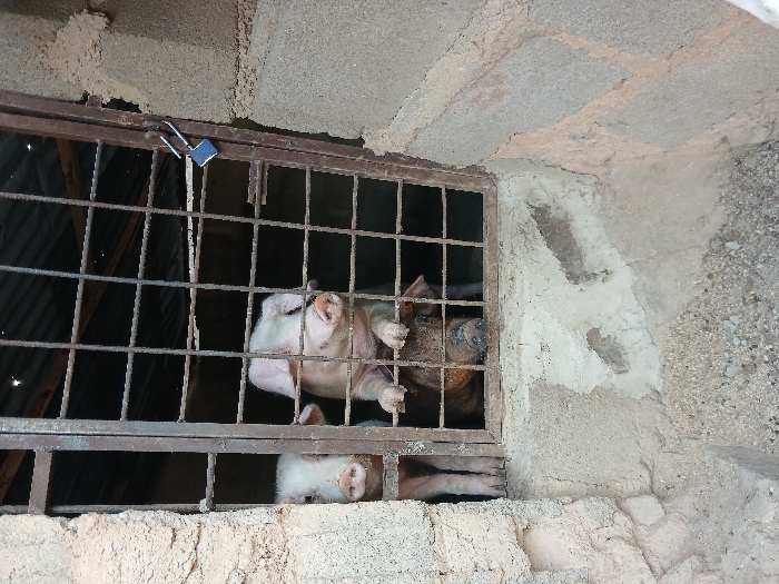 - "Two pigs are confined behind a locked metal grate, set into a weathered concrete structure" by FM-EgUYT2, licensed under CC BY 4.0