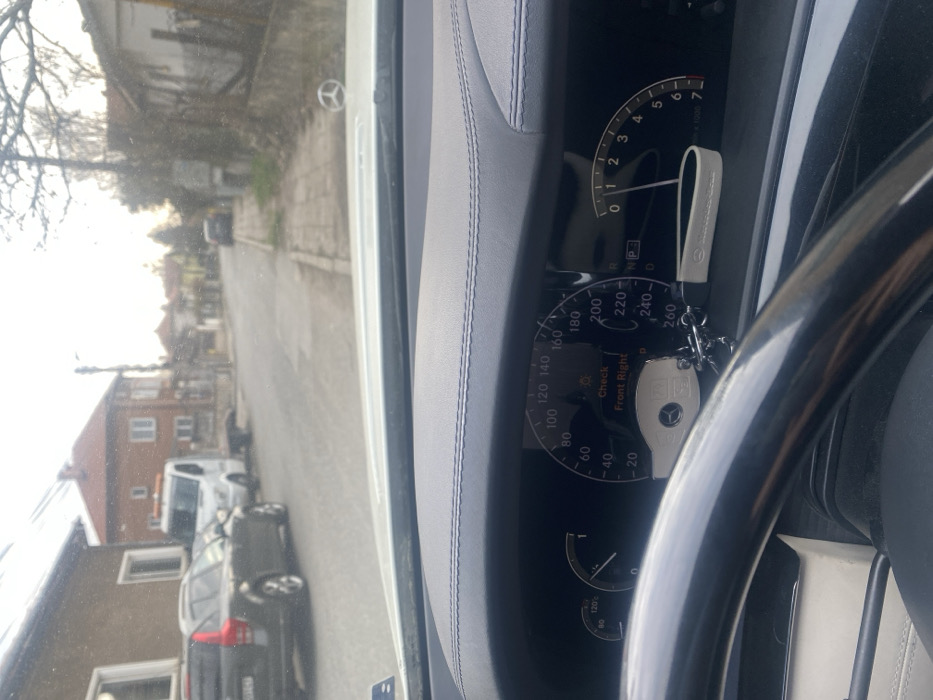 The scene depicts a street view from the interior of a stationary Mercedes-Benz vehicle in Elin Pelin, Bulgaria, on an overcast or hazy day. The foreground shows the vehicle's dark-colored dashboard with prominent stitching and the illuminated instrument cluster. A digital display on the cluster shows a speedometer, a tachometer, a fuel gauge, and a "Check Front Right" warning message. A white Mercedes-Benz key fob with an attached white keychain is visible near the center of the instrument cluster. The top portion of a glossy, dark steering wheel is present in the lower-left corner. The Mercedes-Benz star hood ornament is visible through the windshield. Beyond the windshield, an asphalt street extends into the distance, flanked by sidewalks or unpaved shoulders. On the left side of the street, a dark gray Volvo station wagon is parked, followed by a white flatbed tow truck, likely a Mercedes-Benz Sprinter, equipped with an orange warning light bar on its roof. Older, residential buildings with varying facades and red-tiled roofs line both sides of the street. Specifically, a two-story building with a reddish-brown facade and a single window is visible on the left. On the right, more modest structures and bare-branched trees are present. No individuals are visible, and no direct actions or interactions are occurring in the visible portion of the exterior scene.