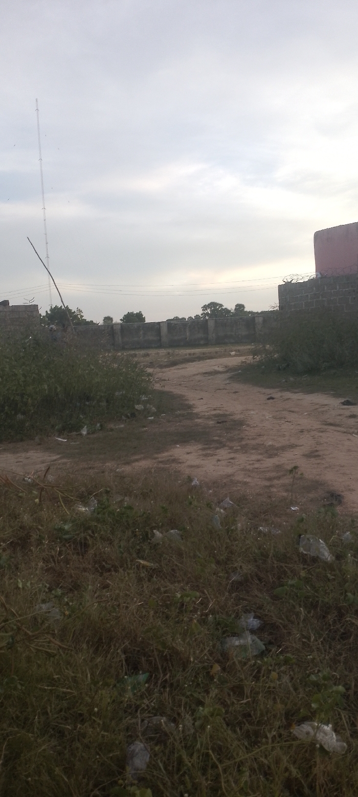 The image displays an outdoor environment in the city of Unknown, Unknown, under an overcast sky. The foreground is characterized by dry, sparse green and brown grass, interspersed with numerous pieces of white and clear plastic litter. A dirt path, approximately three meters wide, extends from the lower right of the frame, curving towards the left and receding into the distance. To the left of this path, a dense area of green bushes and weeds is present. In the midground, a long, low concrete wall, composed of segmented grey blocks, stretches horizontally across the scene. Beyond this wall, a line of green trees is visible. On the far left, a tall, slender, multi-sectioned antenna or communications mast rises prominently against the sky. On the far right, a partial view of a building or structure shows a lower section of dark grey blockwork topped with coils of barbed wire, above which a solid reddish-pink wall section extends upwards. No individuals, actions, or interactions are visible in the scene.