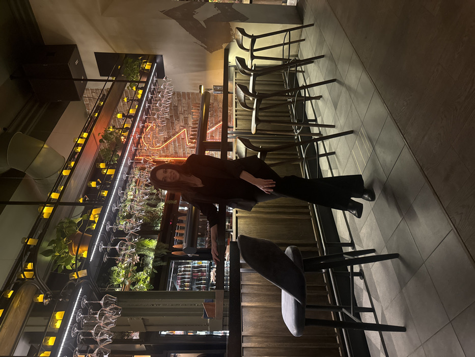 The image displays the interior of a dimly lit bar or restaurant in Voronezh, Russia. The precise location within Voronezh is not discernible from the visual evidence. A single adult female, estimated to be between 30 and 40 years old, is the central subject. She has long, dark brown hair and is looking directly at the camera with a slight smile. She is dressed in a black blazer with sleeves pushed up, a dark V-neck top, black flared trousers, and black high-heeled boots. She stands with her left arm resting on a dark wooden bar counter and her right hand resting on her right thigh, with her right leg slightly crossed in front of her left. The bar counter is constructed of dark wood with vertical slatted paneling on its front surface and a smooth, dark top. A single dark grey upholstered bar stool is positioned directly in front of the bar in the foreground. To the right of the female, five empty, backless wooden bar stools with curved backs are arranged along the counter. Above the bar, a dark metal overhead rack holds numerous inverted wine glasses. This structure also integrates strip lighting and supports several potted plants with trailing green foliage. Additional ambient lighting is provided by multiple small, yellow, candle-like lights placed on shelves and beams above the bar. A prominent orange-red neon sign shaped like the number '2' is mounted on a dark brick wall directly behind the bar. To the left of the female subject, a refrigerated display containing bottles and multiple beer taps are visible behind the counter. The ceiling is dark, featuring visible ventilation ducts. The flooring consists of grey square tiles in the immediate foreground, transitioning to dark wooden floorboards further into the establishment. The overall ambiance is atmospheric and warm, primarily illuminated by the various light fixtures.