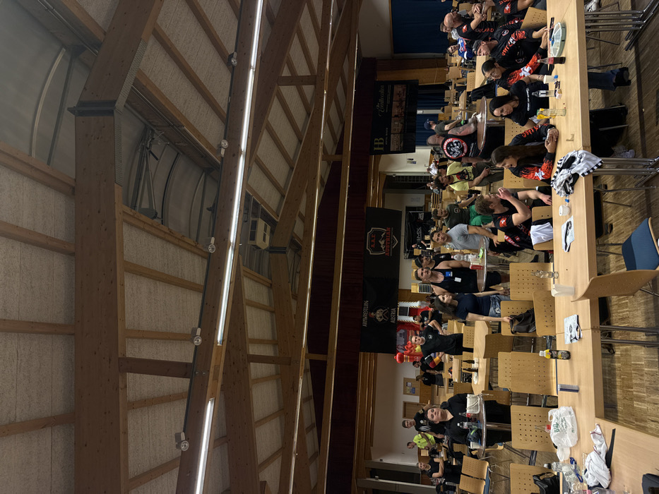 This image depicts an indoor event within a large hall located in Reisenberg, Austria. The venue features a high, vaulted wooden ceiling with exposed structural beams and white acoustic paneling, illuminated by multiple linear fluorescent light fixtures and smaller track lights mounted on horizontal bars. The floor is wooden. Approximately 30-40 adult individuals are visible, standing and seated at numerous light-colored wooden folding tables (both rectangular and round) and matching chairs arranged throughout the hall. Many individuals are engaged in conversation, and various bottles, cans, and cups containing beverages are present on the tables, alongside other miscellaneous items and personal belongings. In the left foreground, a woman in a black top is seated at a small round table. In the midground, several men, some with noticeable muscular physiques, are standing and conversing. In the lower right foreground, a group of women, many wearing black tops with red accents or branding, are seated at a rectangular table, interacting socially. Most attendees are dressed in casual attire. In the background, three large banners are affixed to the far wall: the left banner displays "ARM WRESTLING AUSTRIA" with a graphic of two arm wrestlers; the central banner features the "A.A.E. AUSTRIAN" eagle logo; and a partially obscured banner to the right reads "HB HOTEL REISINGER." A prominent red inflatable object is also visible in the left background. The scene suggests a social gathering, possibly a post-competition or break area for an arm-wrestling event.