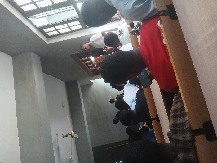 An indoor scene depicts a classroom or lecture hall in Unknown, Unknown, viewed from the rear, looking towards the front and right. Approximately 15-20 individuals are present, seated in multiple rows of light-colored wooden desks. Two individuals are in the immediate foreground: one on the far left wears a plaid shirt, and another, centrally located, wears a red short-sleeved shirt while holding a black smartphone horizontally. A young male in a white short-sleeved shirt stands near large, multi-paned windows with dark frames on the right, with one window pane open. The room has light grey walls and a white ceiling, from which a two-bladed ceiling fan and a recessed light fixture are suspended. Exposed concrete beams are visible on the ceiling and upper walls. Natural light enters through the windows, supplementing the artificial illumination. The individuals are seated, occupying the educational space.