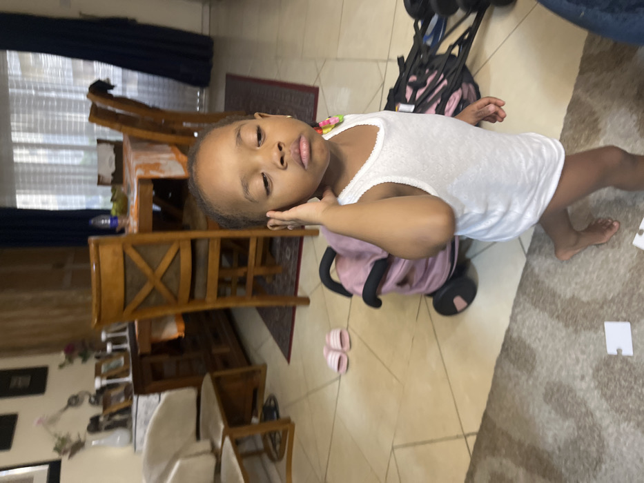 A young girl stands by a baby stroller in a living room. She is fair-skinned and wears a white top. Her right hand is near her ear. In the background, there's a wooden dining table and chairs, a rug, and a glimpse of a window with curtains. There are pink slippers and what appears to be a puzzle piece near her feet. The flooring is tiled, and a rug is visible on the right side of the frame.