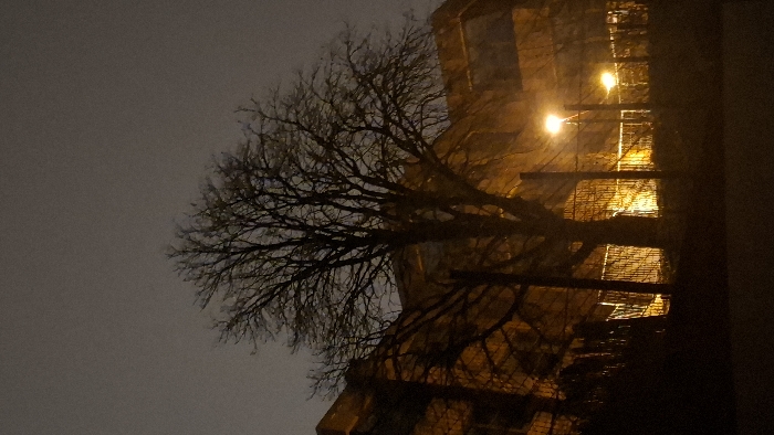 An urban night scene features a leafless tree silhouetted against a building facade, illuminated by streetlights
