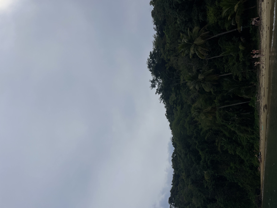 The sky is overcast and gray, filling the majority of the frame. A lush, green hillside covered in dense vegetation and tall trees occupies the right side. A sandy beach lines the edge of the hillside. On the beach, several indistinct figures are visible. The scene conveys a sense of a tropical location.