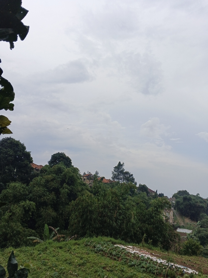 The image presents an elevated, wide view of a vegetated, hilly landscape within the city of Inawi, Papua New Guinea, under an overcast sky. The sky occupies the upper two-thirds of the frame, exhibiting a uniform light grey tone with subtle cloud differentiation. Dark, out-of-focus foliage partially frames the upper-left and lower-left corners. The lower foreground features a cultivated green area with distinct rows of white agricultural ground cover or mulch. Beyond this, dense green foliage, including broadleaf trees and taller conifers, covers the sloping terrain. Several structures, characterized by reddish-brown tiled roofs and light-colored walls, are visible amidst the trees and along the hill crests in the midground, suggesting residential development or construction. A light-colored path or natural erosion mark descends a slope on the far right. No people or specific activities involving individuals are present.
