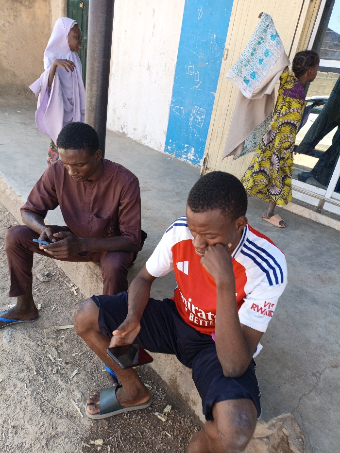 In Zango, Nigeria, two young men sit in the foreground of an outdoor scene. The man on the left, clad in a dark reddish-brown tunic and trousers, sits on a concrete ledge, focusing on a blue smartphone held in both hands. He wears blue flip-flops. To his right, another young man, wearing an Arsenal FC jersey (red and white with "Emirates Fly Better" and "RWANDAIR" logos) and dark blue shorts, sits lower on the ground, holding a black smartphone in his left hand while his right hand rests near his face. He wears dark green slides. The ground beneath them is dirt with scattered debris. In the background, a light-colored building wall features a distinct vertical blue stripe with white chalk-like markings. A dark vertical pole stands between two additional figures: a girl on the left wearing a light purple head covering and garment over patterned trousers, and a girl on the right in a yellow and purple patterned dress, carrying a light-colored, patterned textile over her shoulder. The second girl is partially visible near a reflective glass door or window. The scene is illuminated by daylight.