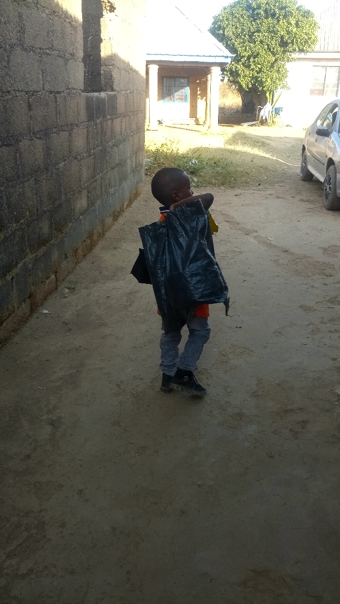 An unidentifiable young child, observed from behind, walks left-to-right on an unpaved dirt path in an unidentifiable residential area of Jos, Nigeria. The child wears an orange polo shirt, light blue jeans, and dark shoes, carrying a large black plastic bag draped over their right shoulder and a smaller black plastic bag over their left shoulder. To the immediate left, a light-colored concrete block wall runs parallel to the path, partially illuminated by direct sunlight. In the background, to the right, a single-story building with a light-colored roof features a porch supported by two white columns, with a blue-framed window visible. A large green tree stands behind this building. A silver sedan car is parked on the right side of the path, partially visible. The ground is composed of packed earth with scattered dry vegetation. The scene is brightly lit by natural sunlight, indicating daytime.