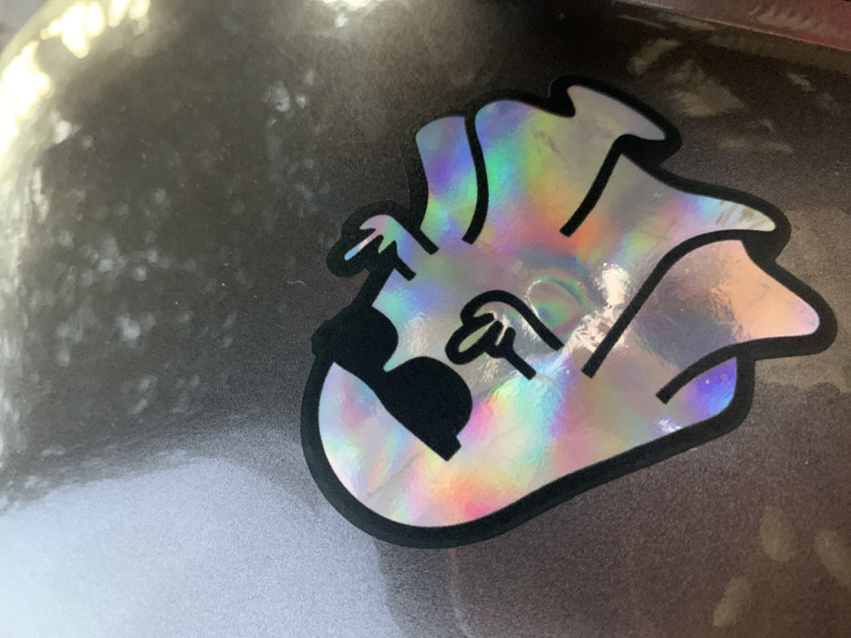 A holographic sticker of a cartoonish, sad or scared ghost with hands raised is adhered to a gray surface