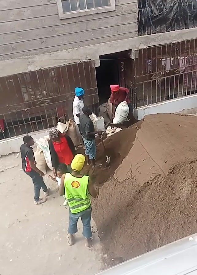 In an outdoor scene, a group of seven people are performing a task, potentially labor-related, as they work near a pile of what appears to be soil or sediment. These individuals are dressed in casual clothing, with one wearing a green safety vest with "Shell" branding and another with a yellow hard hat. They are positioned next to bags which could contain construction materials, lying on the ground close to the soil mound. The setting appears to be an urban area, as indicated by the nearby building with windows and a security grill. A vertical shot provides an aerial view of the scene, displaying the arrangement of the people, the pile of soil, and the building facade.