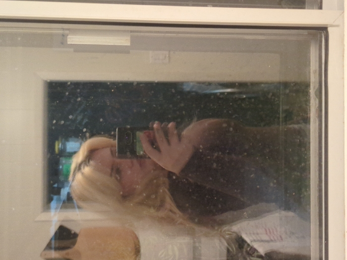 A female individual with long, light-colored hair and dark roots, wearing a dark long-sleeved top, is captured in a selfie reflected in a heavily speckled window or mirror