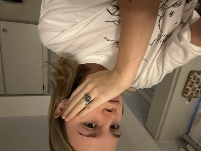 A person is pictured from a low angle. The individual is wearing a white t-shirt with a dark graphic design. One hand is raised partially obscuring their face, adorned with a ring. The person has fair skin, blonde hair, and light-colored eyes. In the background, there's a light-colored cabinet and wall, along with a patterned phone case that has a wooden handle.
