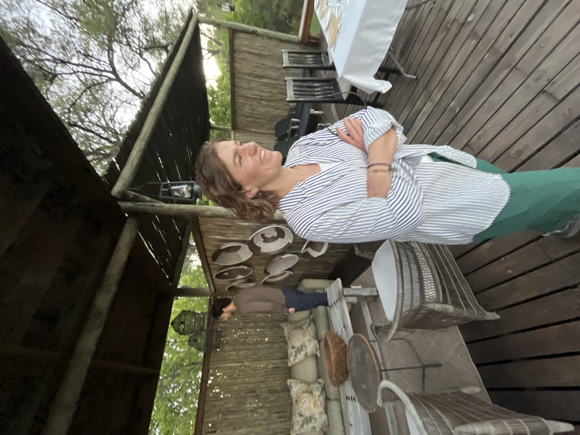 The image depicts an outdoor setting, potentially a patio or deck, possibly located in the vicinity of Khwai, Botswana. A woman in a blue and white striped shirt and green pants stands with her arms crossed, smiling. There are wooden planks, a table with a white tablecloth and place settings, and several chairs in the background. In another seating area, there is a person in a brown shirt lying down. The area is decorated with what appears to be basket-like items and cushions. The architecture is somewhat rustic, with wooden support beams and what seems like a thatched roof. The environment suggests a safari lodge or similar establishment in a natural setting.