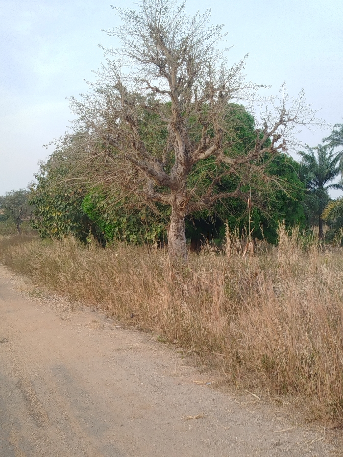 This image depicts an outdoor rural scene in Vana, Nigeria. A large, bare deciduous tree with a thick, light-colored trunk and numerous leafless branches dominates the center of the frame. Behind this tree, a dense cluster of lush green foliage indicates other trees or heavy vegetation. To the far right, the dark green fronds of a palm tree are visible. The foreground and midground consist of dry, light brown grasses and stalks, appearing sparse to the left and denser to the right of the bare tree. A dirt road or path, light brown in color, occupies the left side of the foreground, curving slightly into the distance. The sky above is a pale, uniform light blue or overcast grey, lacking distinct clouds. No people, animals, or man-made structures are visible.