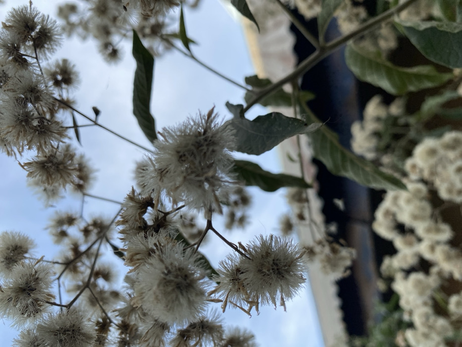 Fluffy white flowers with delicate, bristly petals dominate the scene, contrasting with a soft blue sky in the background. Green leaves with prominent veins are interspersed among the flowers, adding depth and texture. The angle suggests looking upwards, capturing a glimpse of nature against the sky. A building structure with blue paint is partially visible in the upper right corner. The lighting is soft and diffused, highlighting the intricate details of the floral arrangement.