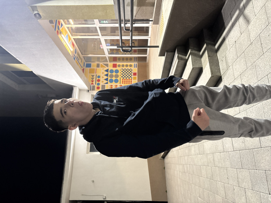 The scene, located outdoors at night in Botevgrad, Bulgaria, features a young male standing on grey paver stones. The subject, of light complexion with short dark hair, is dressed in a dark hooded sweatshirt featuring a white logo on the chest, and light grey sweatpants with a dark stripe on the left leg. His posture includes clenched fists at hip level and his tongue extended, angled towards the right. In the background, a multi-story building with a light-colored facade is visible. A section of the building to the subject's right is adorned with a colorful geometric mural, incorporating shapes such as squares, circles, and triangles in primary and secondary colors. Below the mural are illuminated glass entrance doors. To the right of the entrance, concrete steps with a black metal handrail ascend, alongside a ramp section marked with yellow tactile paving. Artificial lighting illuminates the area, creating shadows.