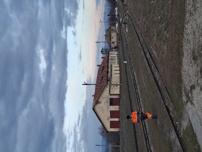 The scene depicts a railway area in Bansko, Bulgaria, under an overcast sky