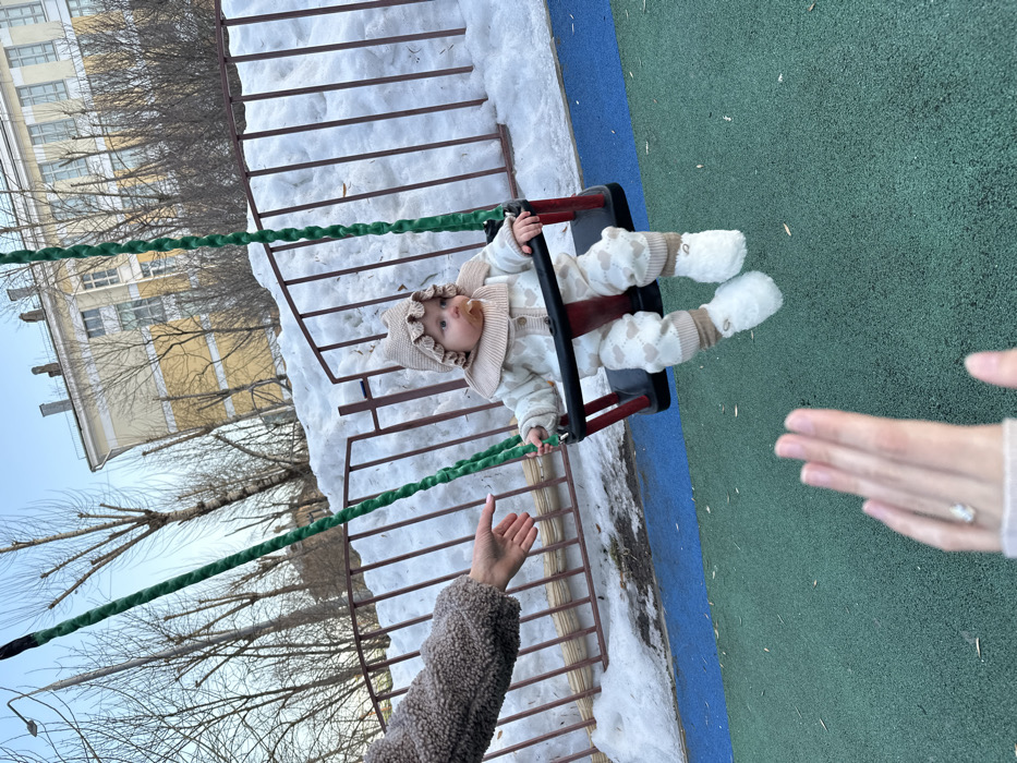 - "A baby wearing a beige knitted hat, matching sweater with small heart patterns, and fuzzy white boots is seated in a red and black swing" by FM-keT4P2, licensed under CC BY 4.0