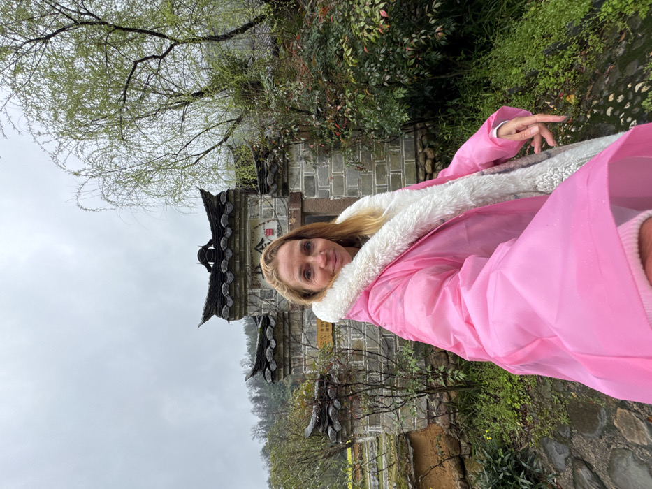 A female subject, appearing Caucasian, stands outdoors, taking a selfie. She is wearing a bright pink hooded waterproof jacket with a white faux-fur lining. Her expression is a slight smile. Behind her is a traditional Chinese-style stone wall or gate structure with two dark-tiled, peaked roofs and grey brickwork. Chinese characters are visible on a central plaque on the structure, with a red square emblem positioned below. Lush green vegetation, including deciduous trees with newly sprouted light green leaves and evergreen shrubs, surrounds the structure. To the left, a distant hillside covered in trees and patches of yellow foliage is visible. The sky is overcast and uniformly grey. The ground in the immediate foreground appears damp and consists of dark soil and rock. This scene is located in Wulingyuan, China.
