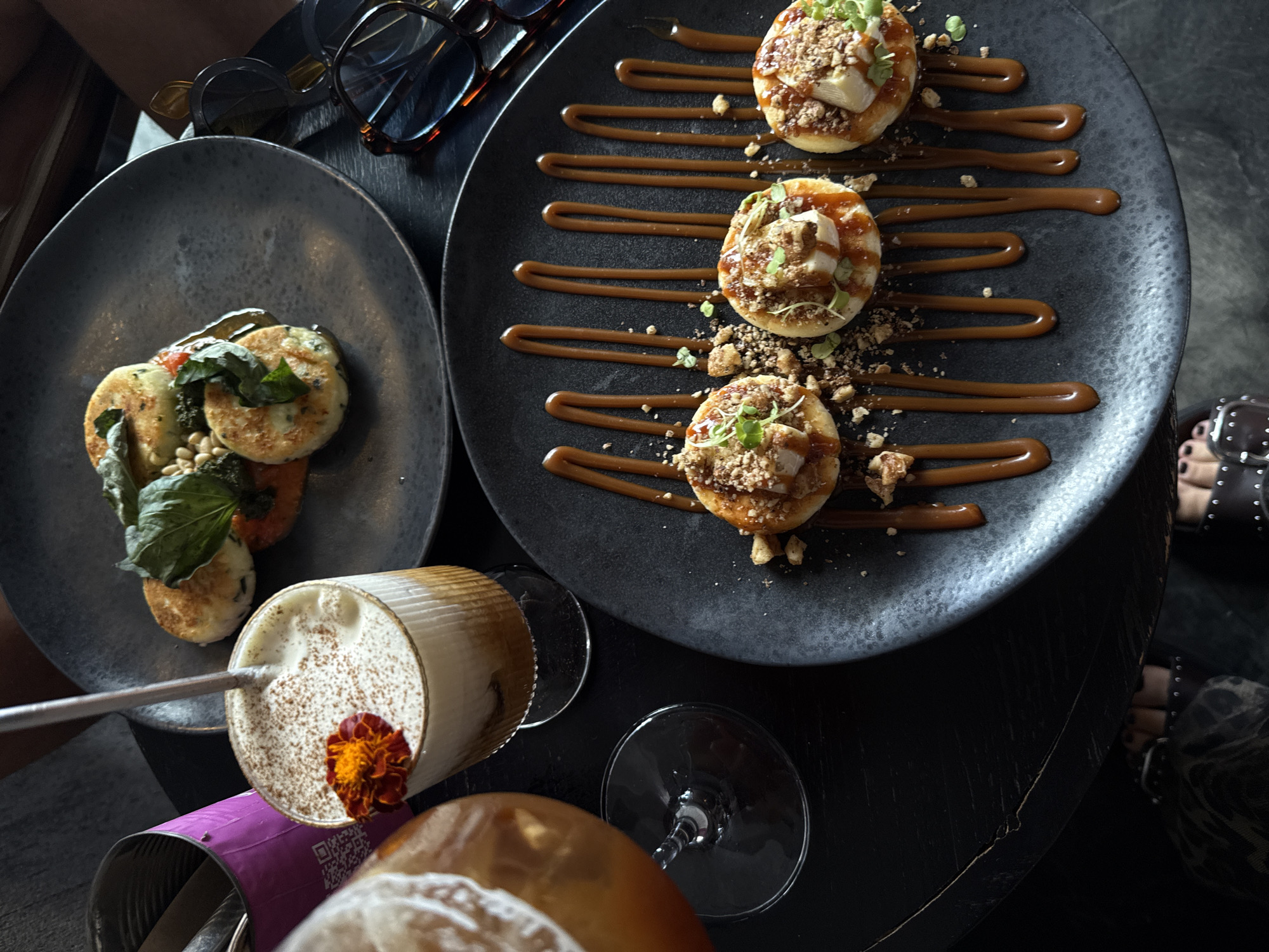 This image shows an aerial view of a table setting, featuring two plates of food, beverages, and personal items, in what appears to be a dining establishment in North Kuta, Indonesia. Plate 1: On the right, a dark-colored plate holds three circular items resembling pancakes or fritters, each adorned with a light-colored topping, possibly cheese or cream, with some form of crumbled garnish and small green sprouts. The plate is decorated with a zigzag pattern of a caramel-colored sauce. Plate 2: On the left, a similar dark-colored plate contains smaller, irregularly arranged fritters or pancakes with what appears to be basil or another green leafy garnish and pine nuts. Some are topped with what may be roasted red pepper. Beverages: A tall glass containing a frothy beverage, possibly a cocktail, is prominent, decorated with a bright orange flower. A metal straw is present. Part of a wine glass and a second beverage container are also visible in the lower center. Personal Items: A pair of sunglasses rests partially on top of the plate to the left. Clothing: A person is partially visible in the lower right, wearing patterned clothing and what appears to be studded footwear. Another person is slightly visible to the left. Environment: The table is a dark, possibly matte finish. The scene is well-lit, suggesting natural lighting or deliberate illumination.