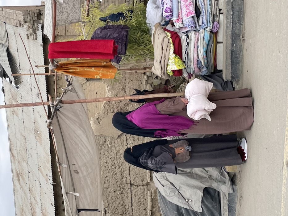 This image depicts an outdoor market scene in Kandahar, Afghanistan, under an overcast sky. In the foreground, two women stand facing right towards an informal stall. The woman on the left wears a dark gray abaya, a black niqab concealing her face except for her eyes, and a black headscarf. She carries a brown, suede-like shoulder bag with a gray pom-pom charm and wears white sneakers with red scalloped trim. The woman in the center wears a light brown abaya, a black headscarf, and a bright magenta shawl draped over her shoulders. Her face is obscured as she is turned partially away, holding a rolled or folded light pink item, possibly a blanket, in her right hand. A third female figure, mostly obscured by the central woman, is visible further back, also facing right. The market stall consists of a makeshift structure with a light-colored, torn fabric canopy stretched over wooden poles. Other wooden poles serve to display merchandise. Hanging from these poles are an orange patterned textile, a bright red textile, and a purple jacket. To the right, two tall stacks of folded textiles, appearing to be blankets, quilts, or fabric goods in various colors and patterns, are displayed on a low platform. Behind the figures, a large, dark gray bundled object rests on the ground. The background features a dilapidated building with a damaged, corrugated metal roof showing multiple perforations or impact marks. Below the roof, an unfinished or mud-brick wall, exhibiting cracks and wear, forms the backdrop. Some green, slender foliage is visible to the far right. The ground is a light gray concrete or asphalt surface.