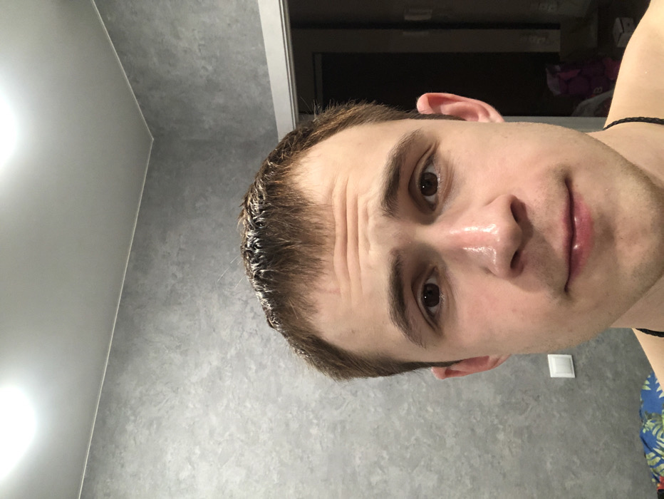 A light-skinned man faces the camera with a slight smile. His hair is short and wet. He has brown eyes and a straight nose. A black cord is visible around his neck. The background features a gray patterned wall and a glimpse into a darker room, suggesting an indoor setting, potentially a bathroom. A light switch can be seen on the wall.
