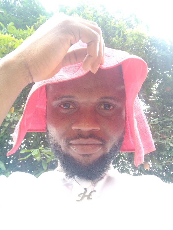 A man with dark skin and a full black beard poses for a close-up selfie, wearing a light pink towel on his head. He's adorned with a silver pendant shaped like the letter "H". Sunlight is diffused across his face, while greenery and trees are visible in the background. He is wearing a white top.