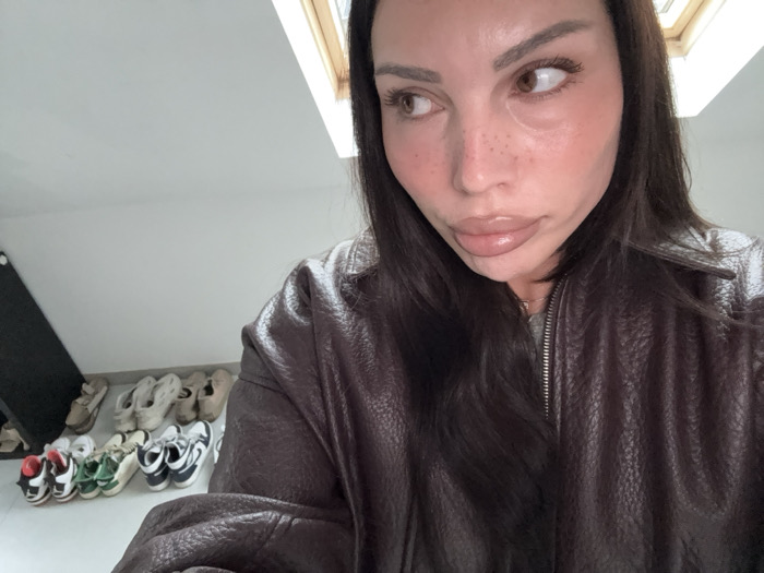The image depicts a female individual in an indoor setting, likely an attic room, characterized by a white sloped ceiling and a wooden-framed skylight in the upper right. The individual, positioned in the foreground, has dark, long hair, light freckles visible on her nose, and wears noticeable lip gloss. She is clad in a dark brown, textured, zippered jacket over a light grey garment, with her gaze directed towards the upper right of the frame. In the background, along the lower left wall, approximately eleven pairs of casual shoes, including sneakers in various colors, are arranged in two rows on a light-colored floor. A dark, angular object is partially visible leaning against the wall on the far left. The specific location within Tielrode, Belgium, cannot be determined from the visual information presented in the image.