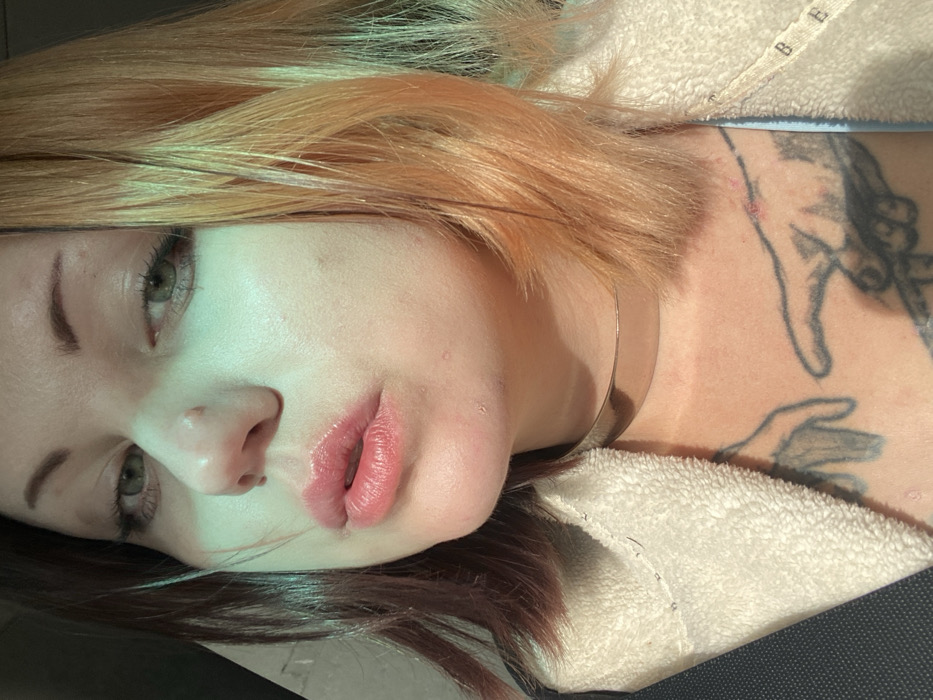 A close-up portrait of an individual, identified as female, is depicted, with the scene understood to be located in the city of Kruče - Kërruçi, Montenegro. The subject's face is illuminated by a strong, split-lighting effect, presenting a greenish-blue hue on the left side of the face, including the left eye and nose, and a warmer, yellowish light on the right side, illuminating the right eye and hair. The individual possesses green eyes, dark well-defined eyebrows, and a small, raised lesion or scar is visible on the right side of the nasal bridge. Her lips are full, appear glossy, and have a reddish-pink tint, slightly parted. Her hair is multi-toned, exhibiting a dark reddish-brown color on the left side of the frame and transitioning to an auburn or orange-blonde on the right. A metallic, polished choker-style necklace is present around her neck. Her attire includes what appears to be a light-colored, textured, possibly fleece-lined collar on the right side, and a darker garment, possibly navy or black, visible on the left side of her body. A prominent tattoo featuring two hands reaching towards each other, consistent with a stylized depiction of "The Creation of Adam," is visible on her upper chest/décolletage area. The background is indistinct, dark, and out of focus, providing minimal environmental context. The individual's gaze is directed towards the camera.