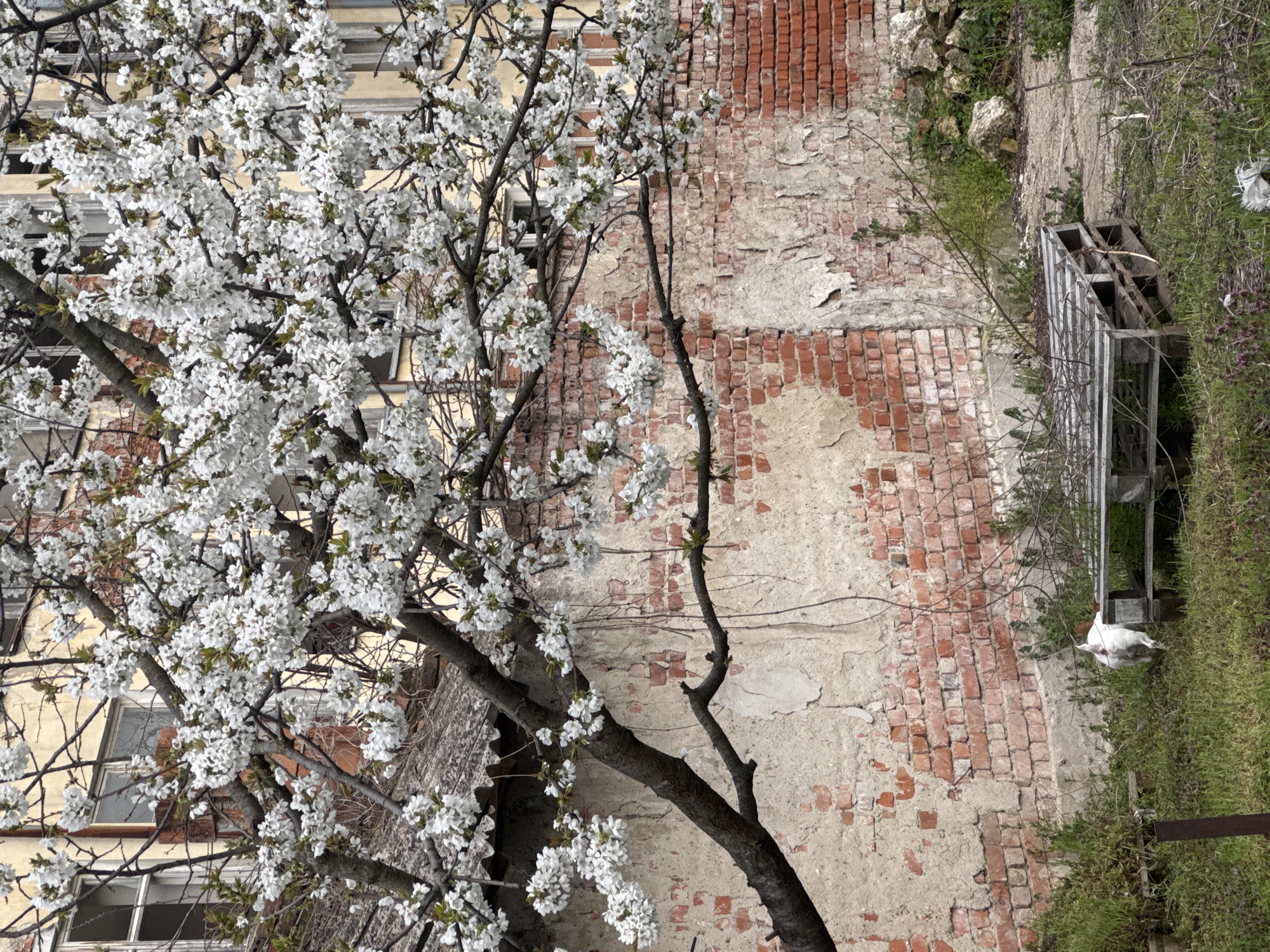The image captures an outdoor scene in what is likely an urban environment. A blossoming tree with white flowers dominates the left side of the frame, partly obscuring a building with windows. To the right, a dilapidated brick wall shows signs of disrepair and weathering. Near the wall, there is an old, metal pallet or frame positioned on the ground, partially concealed by overgrowth. A white duck or goose is present near the pallet. Based on the architecture and brickwork, it is plausible this photograph was taken in Ruse, Bulgaria, as the city is known for similar architectural styles. The scene suggests a juxtaposition of nature and urban decay.