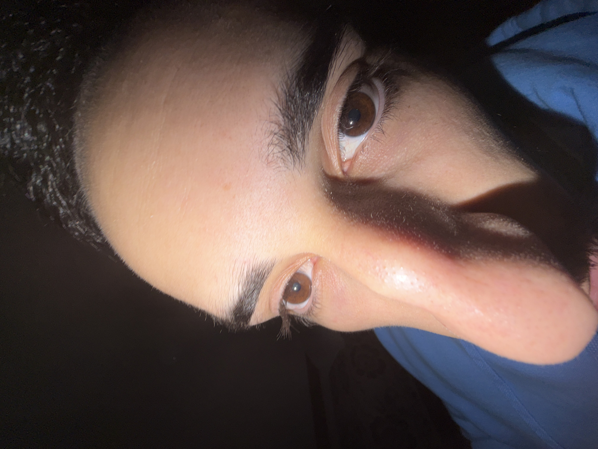 A close-up, tilted perspective image of a person's face. The focus is on the forehead, eyes, and nose. The person has dark hair and eyebrows, and brown eyes. A blue garment is visible on the right side. The left side of the image is dark. No specific environment is identifiable, making it impossible to confirm a location in Milevo, Bulgaria.