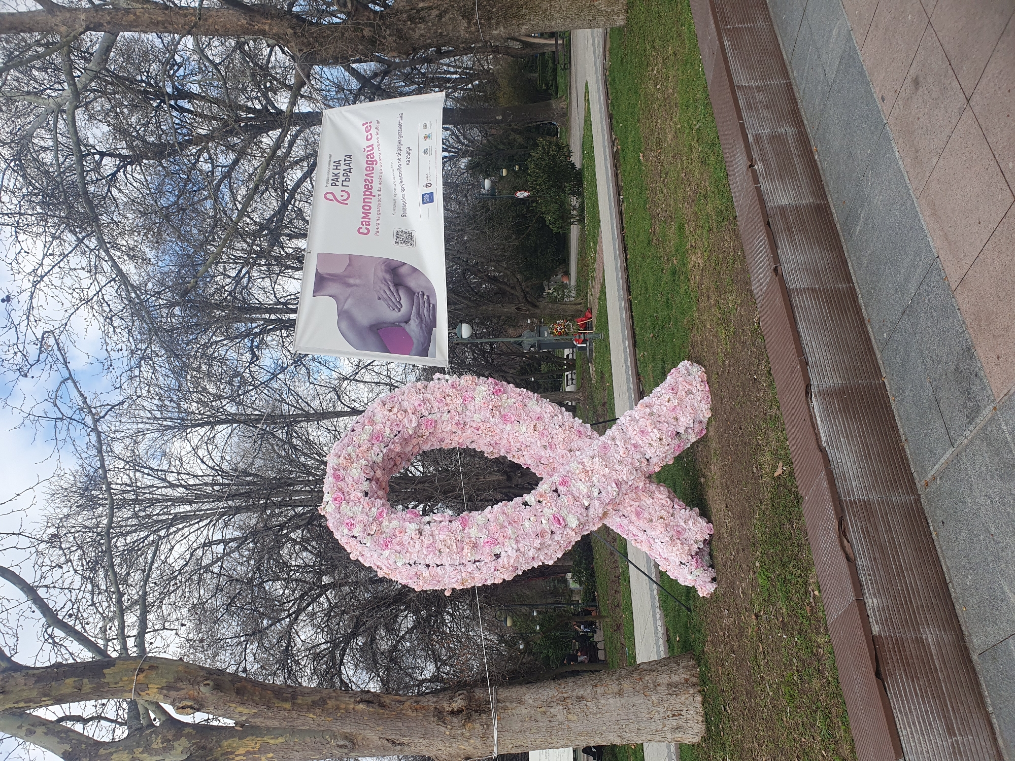 The image displays a scene within Tsar Simeon Garden, Plovdiv, Bulgaria, under a partially cloudy sky. A large, three-dimensional sculpture of a breast cancer awareness ribbon, approximately 2 meters in height, stands on a patch of green grass in the foreground. The ribbon is constructed from numerous artificial light pink and white flowers. Behind and to the right of the floral ribbon, a white fabric banner is horizontally suspended between two mature, bare deciduous trees. The banner features Bulgarian text related to a national breast cancer campaign, including "РАК НА ГЪРДАТА" (Breast Cancer) and "Самопрегледай се!" (Self-examine!), accompanied by an illustration of a female torso demonstrating breast self-examination, a QR code, and multiple institutional logos, one explicitly identifying "ПЛОВДИВ." The trees are leafless, indicating a late autumn or winter period. The ground consists of green grass and paved walkways made of grey and reddish-brown tiles, separated by a low retaining wall with brown, ribbed tiles. In the mid-ground and background, additional bare trees, park benches, streetlights, and a dark statue on a pedestal adorned with wreaths are visible. A few indistinct figures are seated on distant park benches. No prominent actions or interactions are occurring in the immediate foreground.