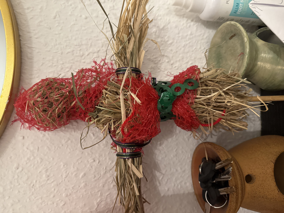 - "A St. Brigid's cross made of straw with red mesh embellishments and black and green ribbon binding the lower stem and a cluster of green rings on one arm. The cross is positioned on a textured white wall. To the right are partial views of a white bottle, a green vase, and a brown vase with keys. A partial view of a gold mirror is on the left." by FM-Mispt2, licensed under CC BY 4.0