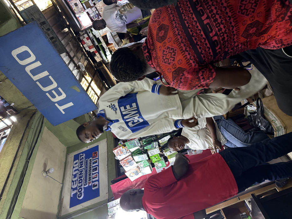 The image depicts an indoor commercial space in Fegge, Nigeria, identified by a prominent blue sign overhead displaying "TECNO GOLDEN NEST Communications" with a phone number (08162683458), and a larger blue banner featuring the word "TECNO." Six individuals are visible within the frame. In the immediate foreground, a person is seated with their back to the camera, wearing a short-sleeved red shirt with a black geometric pattern. To their left, a bald man in a red short-sleeved t-shirt and dark jeans stands, facing towards the left side of the frame, seemingly engaging with someone. Centrally, a man wearing a white long-sleeved polo shirt with a horizontal blue stripe across the chest, bearing the white text "GAME," and light-colored trousers, stands looking towards his left. Between the bald man and the central standing man, a woman with dark hair, wearing a white t-shirt and blue jeans, is seated on a wooden stool, looking towards the bald man. In the background right, a man in a white t-shirt with a dark graphic print is partially visible. Another person is partially visible further in the background. The environment indicates a market stall or shop, with shelves behind the standing man and sitting woman displaying numerous packaged mobile phone accessories, predominantly in green and clear packaging. The ceiling consists of corrugated metal sheets, some allowing light infiltration, with exposed electrical wiring and a single incandescent light bulb. The walls are painted a light green hue. On the floor near the seated woman, a black plastic bag rests atop a wooden crate.