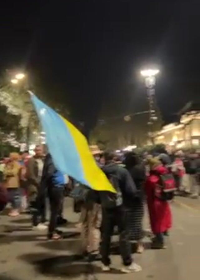 At night, a crowd of people is gathered in front of a building with lit up arches. Many are holding or wearing flags: the Ukrainian flag (blue and yellow) is visible in the foreground, while Georgian flags (white with red crosses) are visible more centrally in the background. The street is blocked off, with yellow dividing lines visible. There are street lamps and plants near the building. Several people are standing in groups, some are talking. Someone is operating a camera.