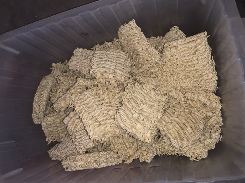 - "A dark, translucent, ribbed plastic storage bin, observed in Unguwar Saya, Nigeria, is filled with numerous blocks of dried instant noodles" by FM-rOkX02, licensed under CC BY 4.0