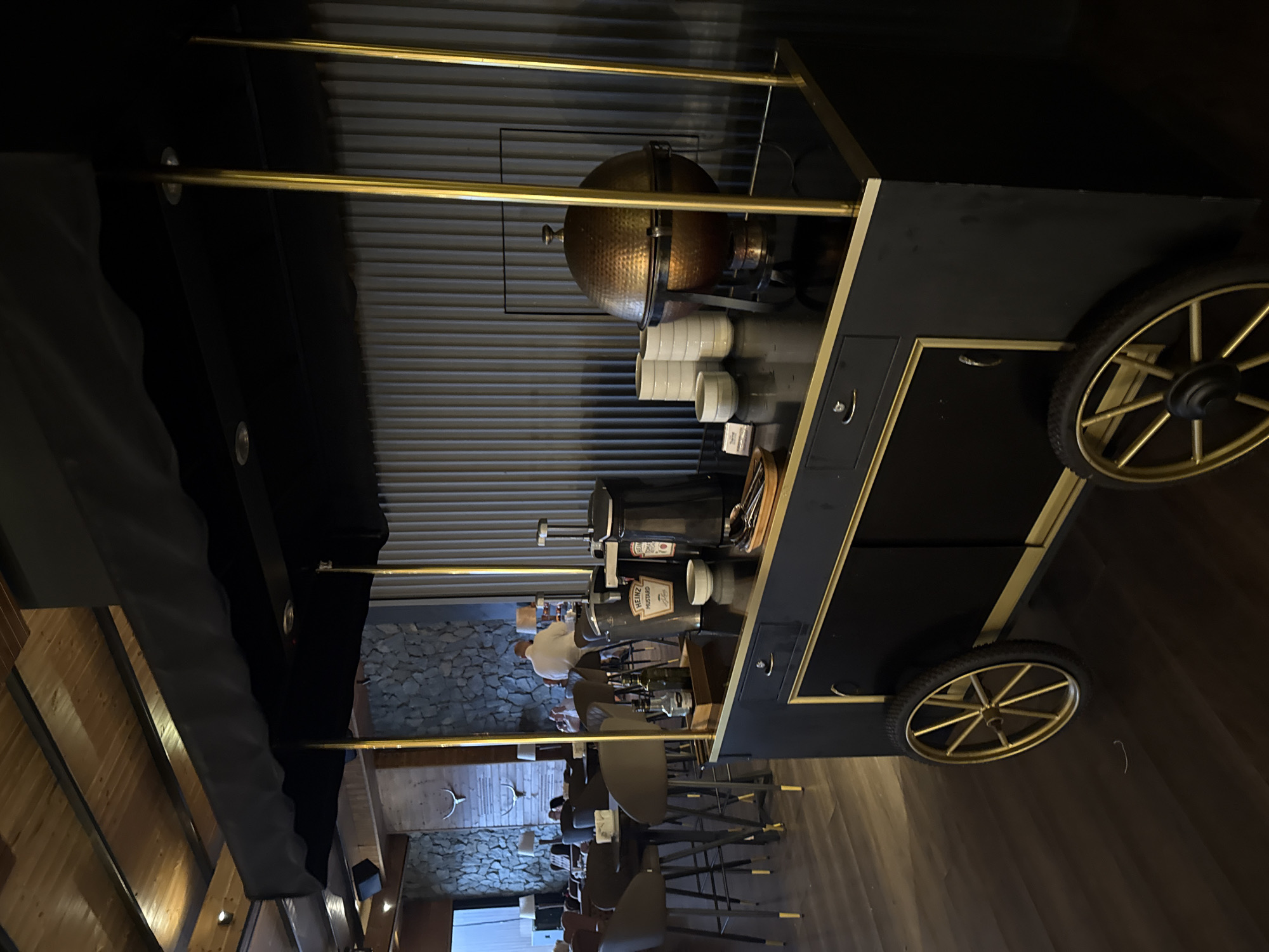 The image depicts the interior of a restaurant or lounge in Bania, Bulgaria. In the foreground, a black mobile serving cart with gold trim and spoked wheels stands on a dark wood floor. The cart features a black fabric awning supported by four vertical gold poles. On the cart's surface, from left to right, are: a small wooden tray holding several bottles (possibly oil and vinegar), a silver bucket labeled "HEINZ MUSTARD," a black beverage dispenser, small white condiment bowls, a wooden tray containing utensils, and a prominent, spherical hammered copper chafing dish with a lid, set upon a dark stand. To the right of the chafing dish, a stack of white ceramic bowls and a stack of smaller white cups are arranged. The background reveals a dimly lit dining area. On the left, several round tables are furnished with dark upholstered barstools featuring gold accents on their legs. A male individual in a white shirt is seated at one of these tables, facing away from the viewer. Another person is partially visible in the distance. The far wall is constructed of rough-hewn stone, adorned with what appear to be mounted antlers or skulls, and illuminated by wall sconces. The ceiling is made of wooden panels with exposed dark beams and recessed lighting. The wall directly behind the serving cart is a dark, vertically corrugated panel.