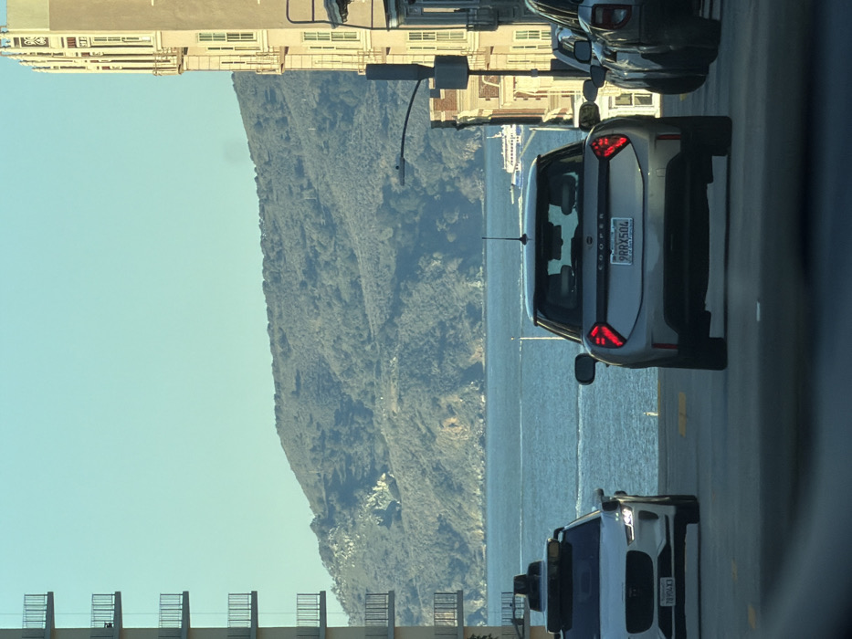 A view from a car window shows a road with cars, including a silver Mini Cooper with license plate "9RRX504." In the background is a body of water and a large mountain covered in trees. Buildings are visible on either side of the road, and the sky is clear blue.