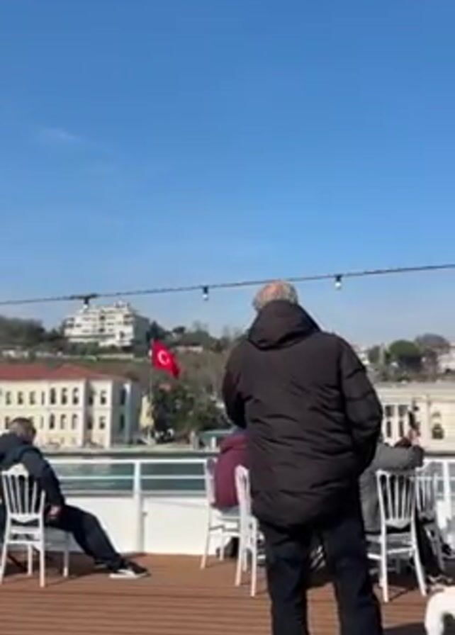sunny day on the deck of a boat. People are seated at tables and in chairs, some looking at the view of the city in the background. The Turkish flag is visible in the distance. A man in a black jacket is standing, facing away from the camera. The deck is wooden, and there are lights strung above. The sky is clear and blue.