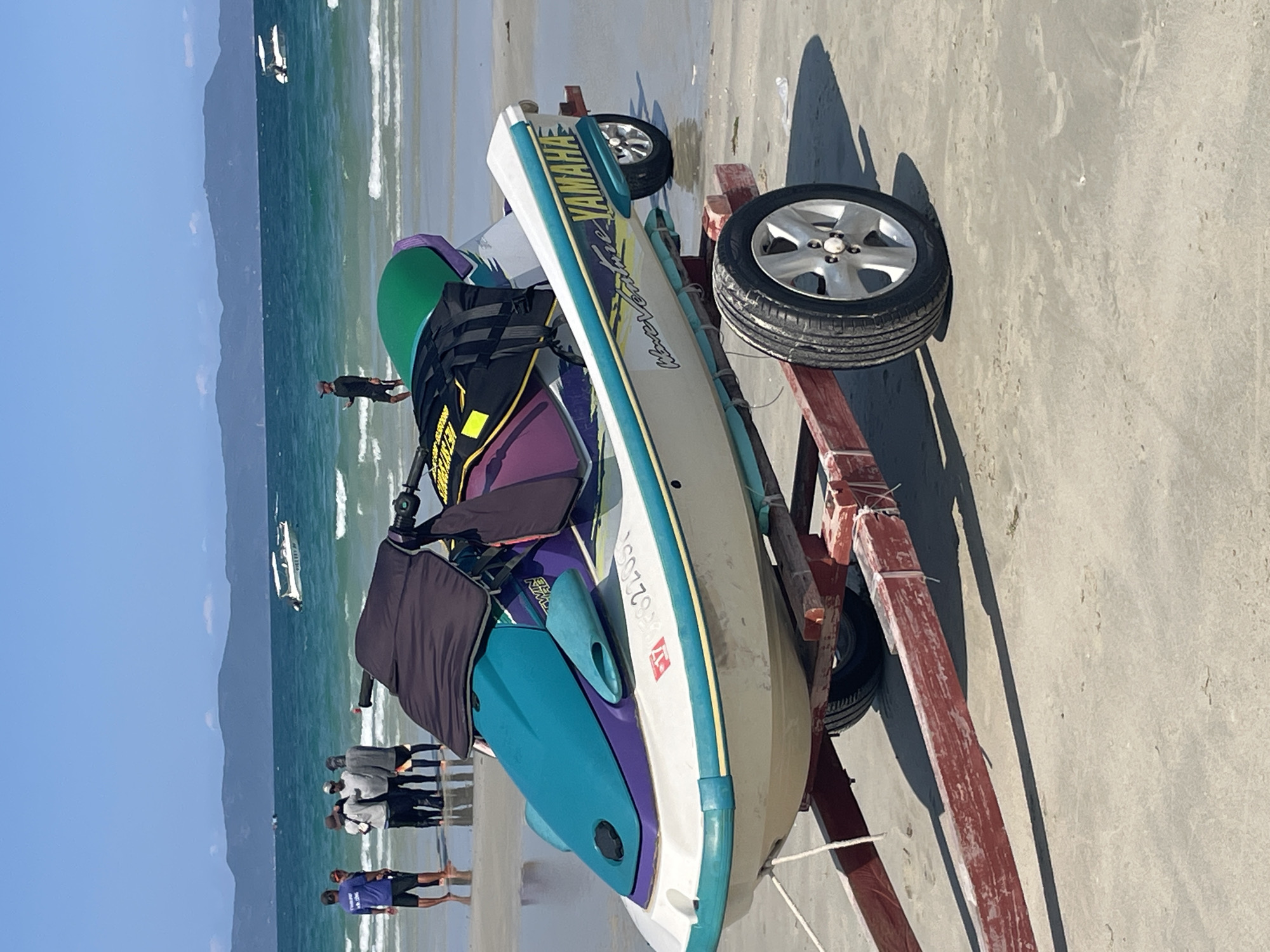 A Yamaha jet ski sits on a red trailer on a sandy beach. The jet ski is teal, purple, and white and is equipped with a black life vest. People are seen walking and standing on the beach near the water's edge. The sea is visible in the background, with distant boats. Mountains are situated on the horizon beneath a clear blue sky. The location is Dong Ninh Hoa, Vietnam.