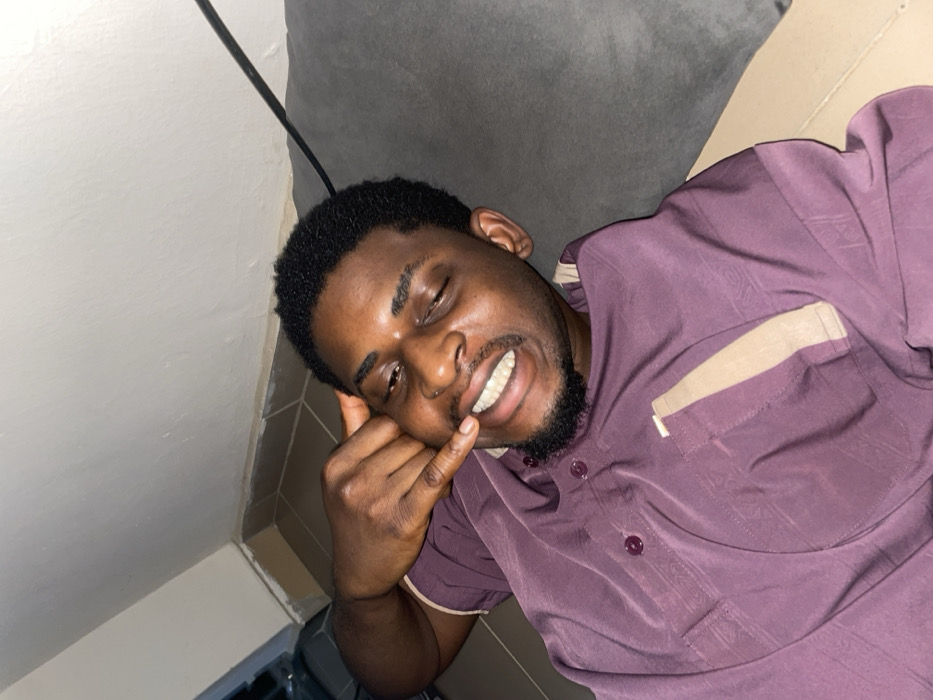 A man with dark hair and a short beard smiles at the camera. He is reclined, possibly on a couch or bed, with a gray pillow behind his head. He wears a purple button-down shirt. His left hand is raised near his face, with his pinky and index finger extended in a "call me" gesture. The background includes a wall and a glimpse of what appears to be a tiled corner. The lighting suggests an indoor setting.