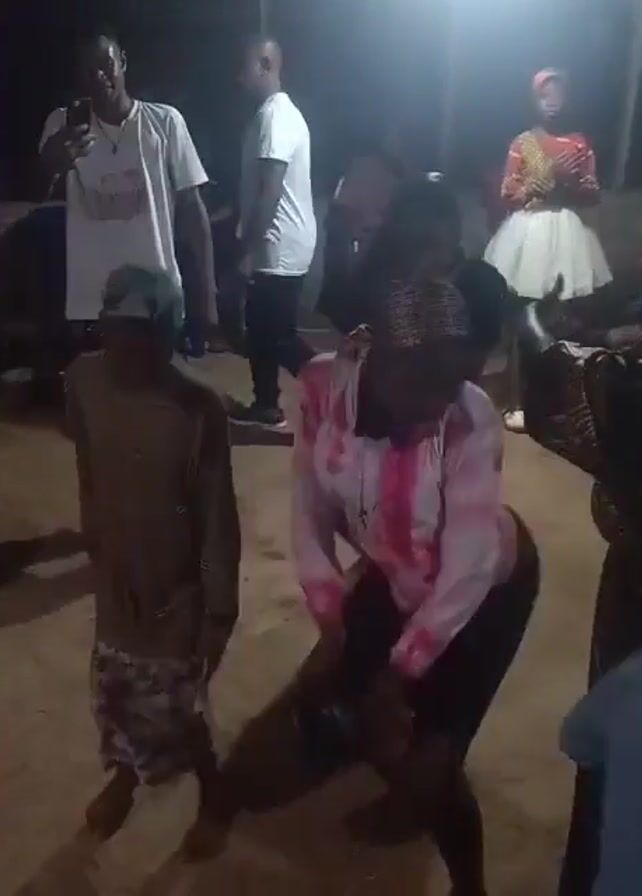 group of people dancing in what appears to be an outdoor setting under artificial lighting. Several people are visible, including two women dancing prominently in the center. One woman is wearing a white shirt with red markings and a black skirt, and she is dancing with a bent posture. An older person in brown patterned clothing is dancing next to her, their head covered. Other people stand around watching and dancing. One man in a white T-shirt is holding up a phone, possibly recording the scene. There are also a few children present. The background features a table and some nondescript structures. The ground appears to be a dirt surface.