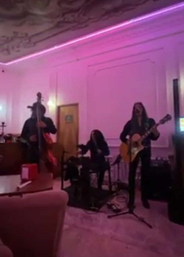 A band of three people performs in a softly-lit room. A man on the left is standing and playing a large stand-up bass. At the center, a figure wearing all black is playing a small drum kit. On the right, a man in black pants and shirt with long dark hair is playing an acoustic guitar and singing into a microphone. The room is lit with pinkish-purple light, and a neon strip light is mounted along the ceiling. A pink chair is visible in the lower left. A closed door is partially visible near the bass player. The band is arranged along the back wall and is playing with some energy.