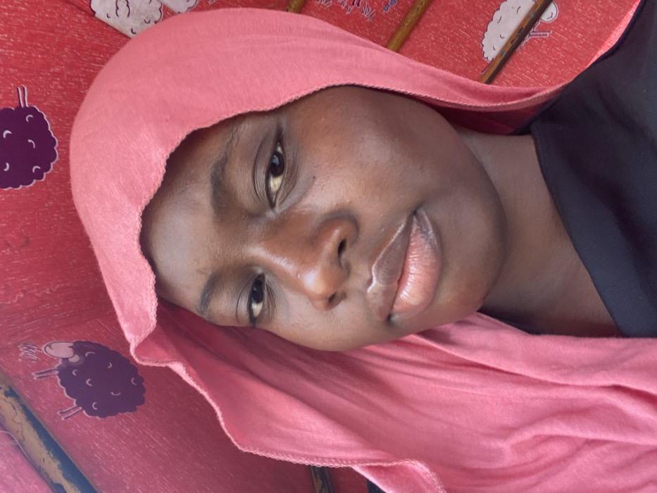 The image presents a close-up, chest-up portrait of a dark-skinned individual with dark eyes, dark eyebrows, and full lips. The individual wears a light pink head covering, possibly a hijab or scarf, draped over the head and shoulders, revealing a black garment underneath at the neckline. The subject gazes slightly to the left of the camera. The background consists of a red fabric or surface with a repeating pattern. This pattern includes dark purple, stylized sheep-like figures with white spots and white cloud-like shapes. The environment is indoors. Specific identifying markers for the city of Katcha, Nigeria, are not present within the frame.