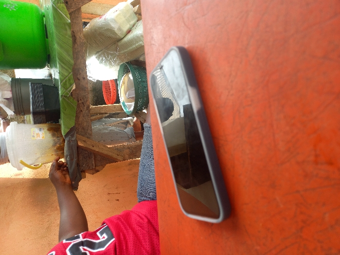 The scene depicts a street food stall in Karmajiji, Nigeria. In the foreground, an orange-red textured table occupies the lower half of the image, upon which a black smartphone in a dark grey case rests, angled towards the right. A person, wearing a red top with white numbering (partially visible as "24") and blue jeans, is seated on the left, with their right forearm and hand resting on the table. In the midground, a rustic wooden stall is visible, topped with a green covering. On this stall are a clear plastic bucket with a yellow handle containing a brownish substance, a stack of black plastic containers, and a large green plastic bucket. Below the stall, a red plastic basket, a green plastic basket holding white items, and stacks of white plastic bags or wrapped containers are present. Another individual's lower legs and brown-shoed feet are visible in the background, underneath the stall structure. An orange wall is seen on the far left. The lighting indicates daylight.